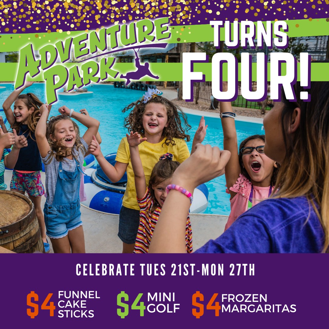 Adventure Park is turning 4! Join us to celebrate with $4 Golf, Margaritas and Funnel Cake sticks ALL Week!