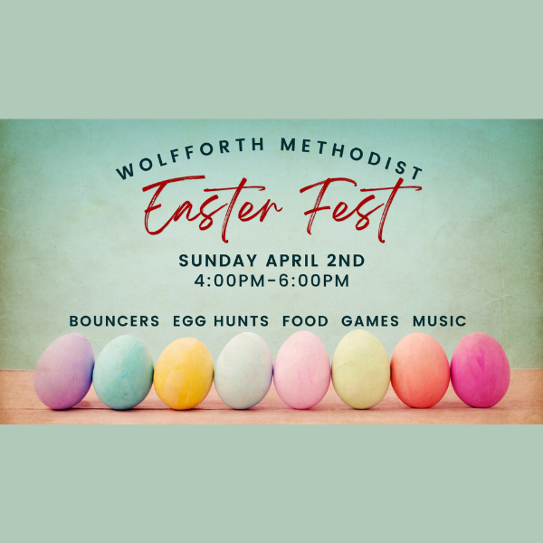 Wolfforth Methodist Church is inviting everyone in our community to join us for Easter Fest! We will have bouncers, food, games, music, an Easter egg hunt, and more. We hope to see you there!